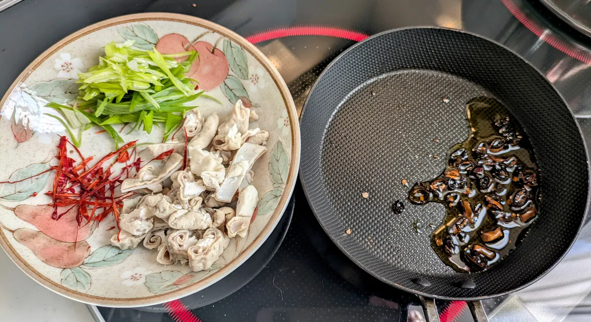 ボイル豚モツ、唐辛子2本分、長ねぎ(青い部分)