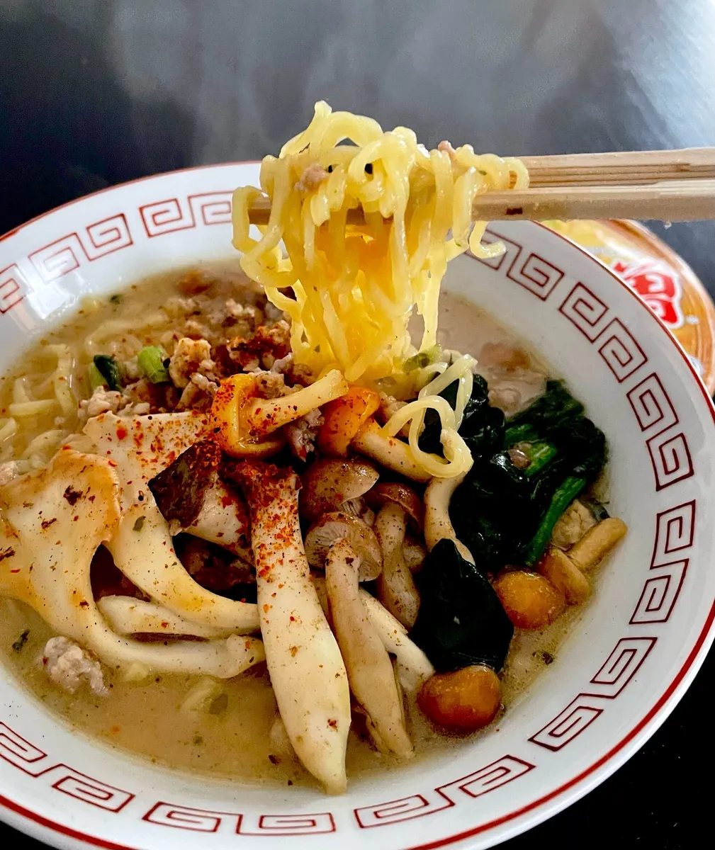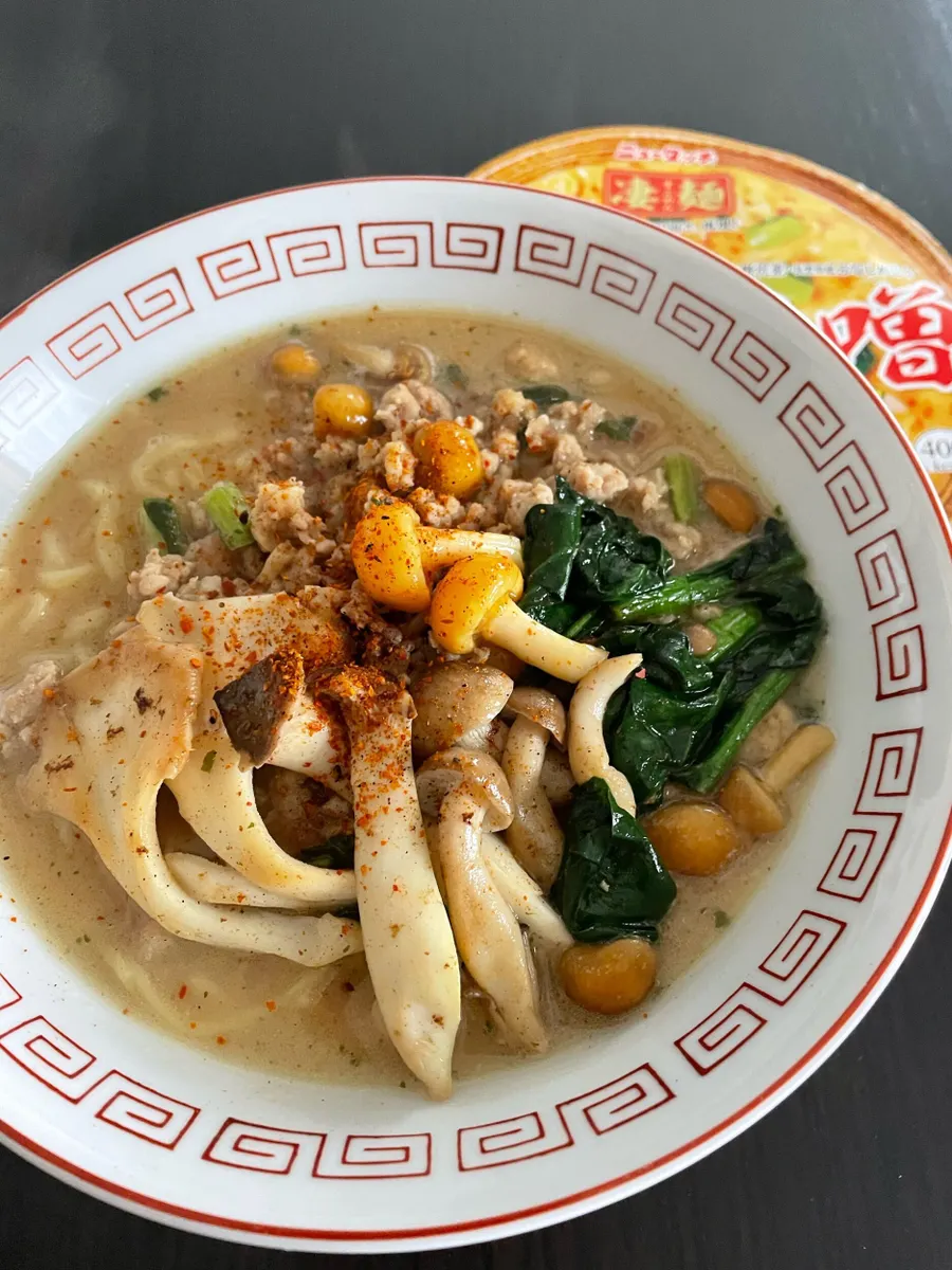 白舞茸・エリンギ・ぶなしめじ・ほうれん草を鶏もも挽肉と一緒にフライパンで炒めてバターを少し絡めてお皿に取り出し、なめ茸はお湯をさっとかけてスタンバイ。さっきのフライパンにお湯をはり本品のスープとかやくを入れてグツグツ沸騰させてから湯切りした麺にかけ、一連の具材を乗せて七味を振って完成です。