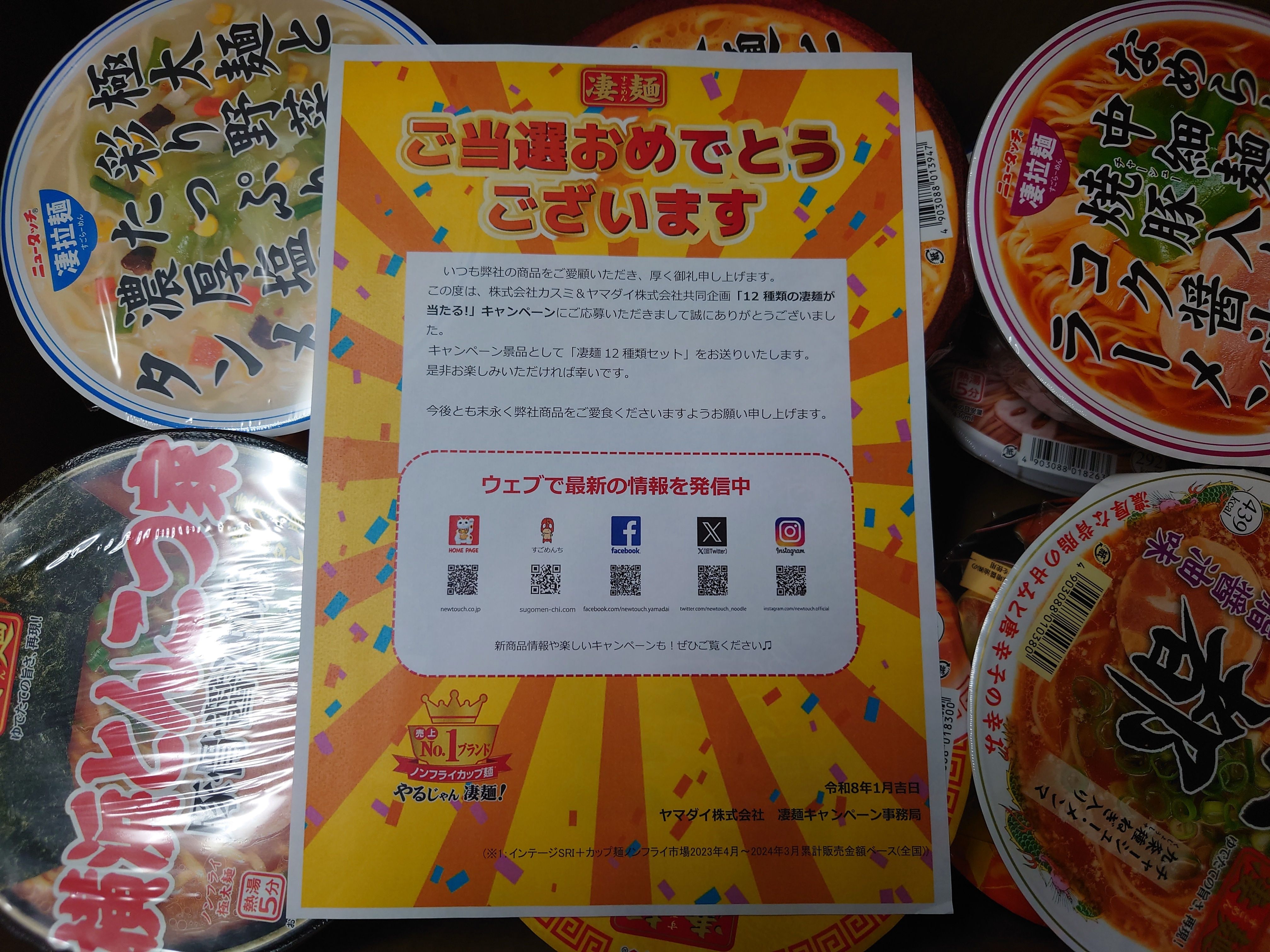 トップ > 今日の凄メシ! > 凄麺 見つけました! > 凄麺マシマシ masa 2026/01/09 20:56 凄麺マシマシ 出張から帰って来たら、凄麺が増えてました😆 年末に応募した、カスミ&ヤマダイキャンペーンに当選したみたいです。正月早々縁起が良いのか、今年の運を早くも使い切ったのか分かりませんが、ヤマダイさんありがとうございます🥰 凄拉麺も入ってました。 いいね 共有する 共有する X facebook LINE リンクをコピー コメントする 12 件の返信 (新着順) ミュートしたユーザーの投稿です。 投稿を表示 kani 2026/01/15 08:47 おめでとうございます! レシート貼って、私もセ◯チューの応募しました〜 masaさんにあやかれますように〜 いいね 返信する ミュートしたユーザーの投稿です。 投稿を表示 masa 2026/01/15 09:01 当選しますようにー🙏 いいね 返信する ミュートしたユーザーの投稿です。 投稿を表示 よっし 2026/01/13 20:43 おめでとうございます。良かったですね。 いいね 返信する ミュートしたユーザーの投稿です。 投稿を表示 ゆず 2026/01/12 19:35 おめでとうございます🎉 新年に嬉しい当選ですね👏 いいね 返信する ミュートしたユーザーの投稿です。 投稿を表示 とはる 2026/01/11 12:11 masaさん 新年早々おめでたい!!!素晴らしいですね~ やっぱり応募してみるものですね!! いいね 返信する ミュートしたユーザーの投稿です。 投稿を表示 masa 2026/01/11 12:46 手間がかかる分、応募者少ないかなーと思いました いいね 返信する ミュートしたユーザーの投稿です。 投稿を表示 あひるん 2026/01/11 12:08 おめでとうございます☺️ 皆さんの投稿で気になっていた凄拉麺、食べてみたいです。 いいね 返信する ミュートしたユーザーの投稿です。 投稿を表示 masa 2026/01/11 12:59 茨城県のふるさと納税返礼品にあるので、ぜひ! いいね 返信する ミュートしたユーザーの投稿です。 投稿を表示 よっし 2026/01/13 20:44 凄拉麺、私も気になっています。ふるさと納税してみようかな。 いいね 返信する ミュートしたユーザーの投稿です。 投稿を表示 39 2026/01/10 12:26 おめでとうございます🎉 年明け早々縁起良いですね🍥 凄拉麺羨ましいです🤤 いいね 返信する ミュートしたユーザーの投稿です。 投稿を表示 masa 2026/01/11 08:07 ありがとうございます。今時レシートをはがきに貼って切手を貼って応募する人はそんなにいないだろうと思って応募しました。 いいね 返信する ミュートしたユーザーの投稿です。 投稿を表示 よっし 2026/01/13 20:44 凄拉麺に興味津々です。食べてみたいです いいね 返信する ミュートしたユーザーの投稿です。 投稿を表示 くろねこ 2026/01/10 10:14 これから始まる当選に次ぐ当選の序章でしょうw 今年は買わなくても過ごせるのでは😊 いいね 返信する ミュートしたユーザーの投稿です。 投稿を表示 masa 2026/01/11 08:08 在庫が90個くらいあるので、これ以上増えると。。。 いいね 返信する ミュートしたユーザーの投稿です。 投稿を表示 くろねこ 2026/01/11 10:52 www想像以上の在庫🚀 100超えますね😏ニヤw いいね 返信する ミュートしたユーザーの投稿です。 投稿を表示 はにんどう 2026/01/10 09:20 おめでとうございます! キャンペーン期間中にカスミいっとけばよかった...😢 いいね 返信する ミュートしたユーザーの投稿です。 投稿を表示 masa 2026/01/11 15:52 はにんどうさんなら、箱買いで何口も応募できますね いいね 返信する ミュートしたユーザーの投稿です。 投稿を表示 勝どき太郎 2026/01/10 09:19 masaさん 使い切った?? これが始まりの序章です。 今年は「午年」 とことん跳ねましょう!! 先ずは「オメデトウ御座います」 masaさんの運を 当方も授かります。 (^_-)-☆ いいね 返信する ミュートしたユーザーの投稿です。 投稿を表示 masa 2026/01/11 15:59 勝どき太郎さんの濃厚とんこつカレーの運を分けてください! いいね 返信する ミュートしたユーザーの投稿です。 投稿を表示 はみちゃん 2026/01/10 03:01 わー、羨ましい!よりどりみどりですね♪ 凄位麺、こちらでも売って欲しいなぁ〜と思います。 いいね 返信する ミュートしたユーザーの投稿です。 投稿を表示 masa 2026/01/11 16:01 茨城県にふるさと納税をぜひお願いします🙇 凄拉麺あります。 いいね 返信する もっと見る