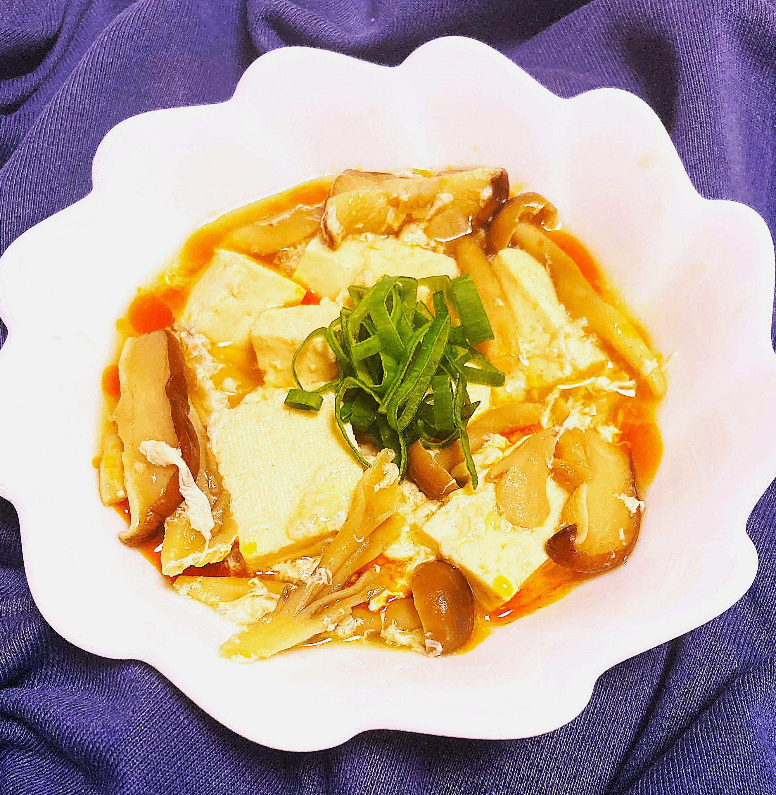材料は豆腐・キノコ(椎茸・シメジ・舞茸)・卵白、トロミがゆるんでいたので追い片栗粉をしました💗 ネギはベランダで再生栽培している九条ネギくんです