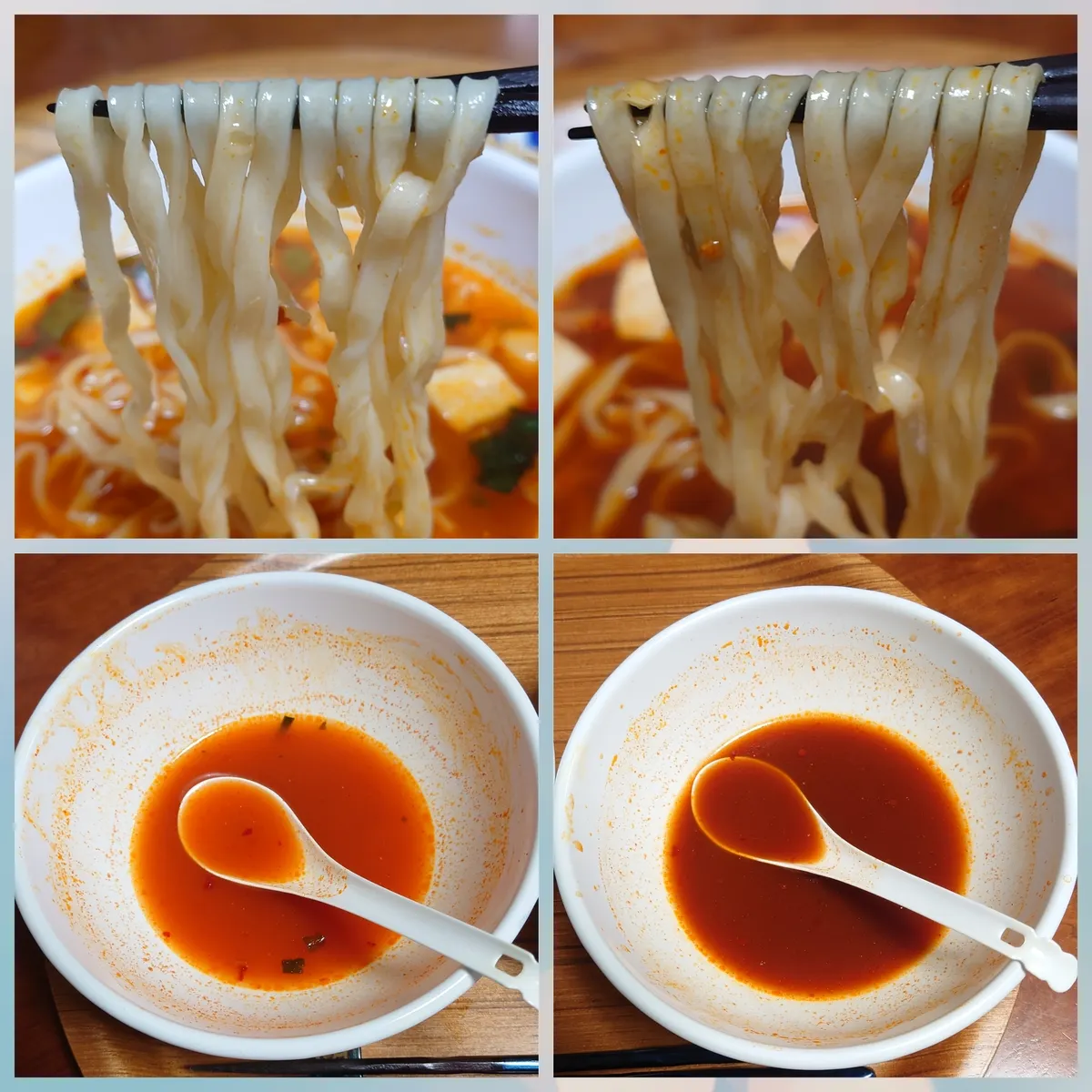 辛味・甘味・酸味等々のバランスが変わってます。今回の『純豆腐チゲうどん』の方が尖った感じがなく全体的にまろやかで辛さも控えめで食べ易い印象。スープの色も結構違うのが見て分かりますよね。