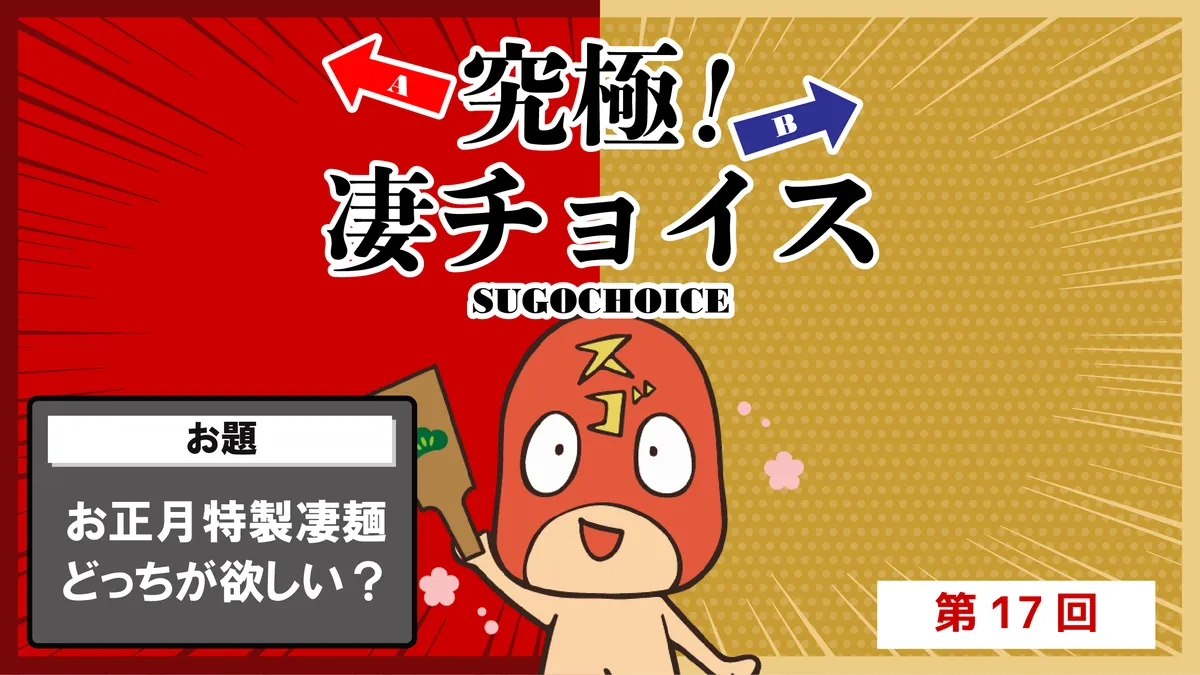 | 「究極!凄チョイス!」は 凄麺やグルメにまつわる"こんなの選べない!"という究極すぎるお題に対して 自分だったらどの選択をするのか、みなさんに投票していただく企画です。 |