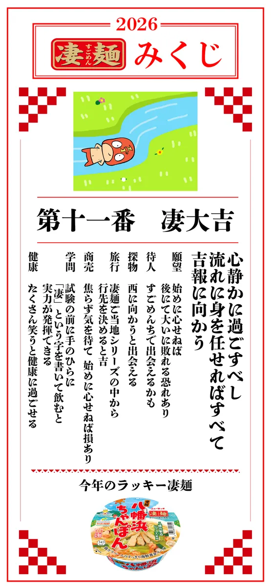 トップ > 今日の凄メシ! > 凄麺 食べました! > 今年のラッキー凄麵を食べました! 部長と平社員 2026/01/10 12:07 今年のラッキー凄麵を食べました! 新年早々に引いた凄麵みくじは「凄大吉」でした。今年のラッキー凄麵が「八幡浜ちゃんぽん」でしたので、冬の福箱より食すのを待って投稿します。 太麺でボリューミー。この麺は食べ応えありですね。とはいえ、デニッシュブレッド3枚と一緒に頂きましたが。 たくさん笑って、たくさん凄麵を食べて、健康に一年を過ごしましょう! 今年のラッキー凄麵 いいね 共有する 共有する X facebook LINE リンクをコピー コメントする 2 件の返信 (新着順) ミュートしたユーザーの投稿です。 投稿を表示 kani 2026/01/15 08:41 スープがキラキラときれいですね! 群を抜いての推し麺です! 皆さまの投稿ですら幸せな気持ちになります! いいね 返信する ミュートしたユーザーの投稿です。 投稿を表示 くろねこ 2026/01/10 15:56 待ち人は「すごめんち」とありますね😊 毎日毎日ログイン生活ですね✨️ いいね 返信する ミュートしたユーザーの投稿です。 投稿を表示 部長と平社員 2026/01/10 23:02 ありがとうございます。 ランク5目指して頑張ります。 いいね 返信する