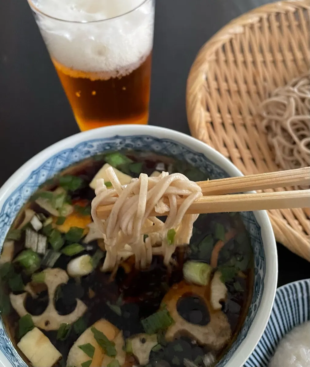 つけけんちん蕎麦としていただきました。つけ汁は熱々、蕎麦は冷水で締めてからザルに。こちらも途中でれんこんのすり流し(粘度強め)を乗せました。