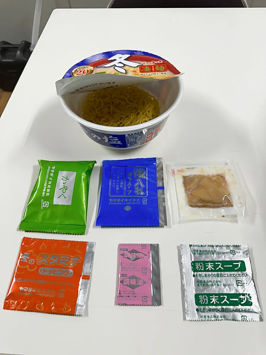 これ全部入れていきます。3個は標準でチャーシューメンマは凄麺のなんかで右下2つは明星の逸品塩用です😅