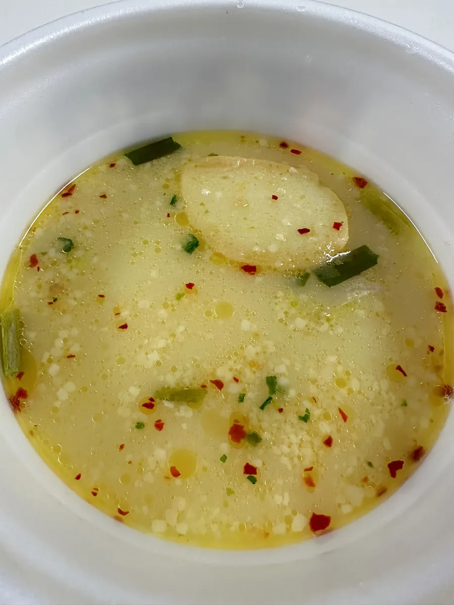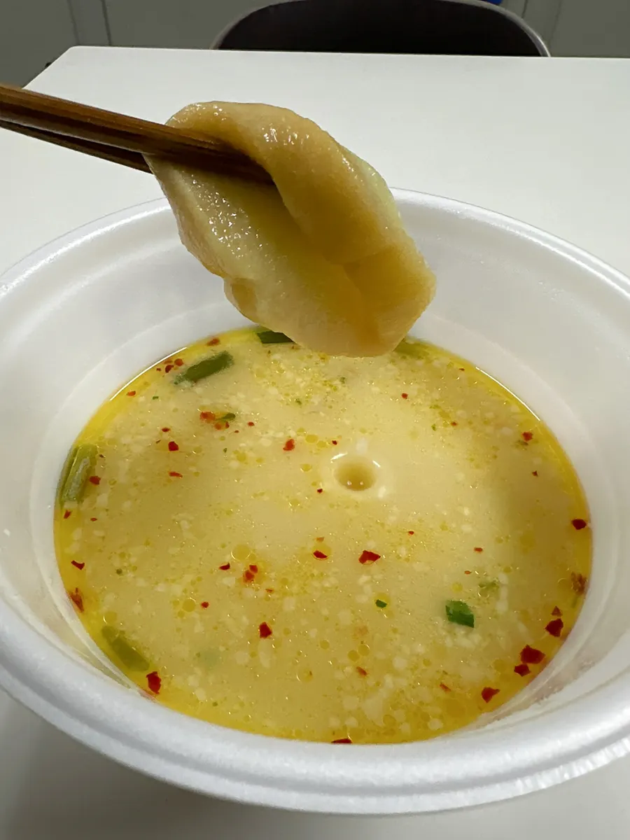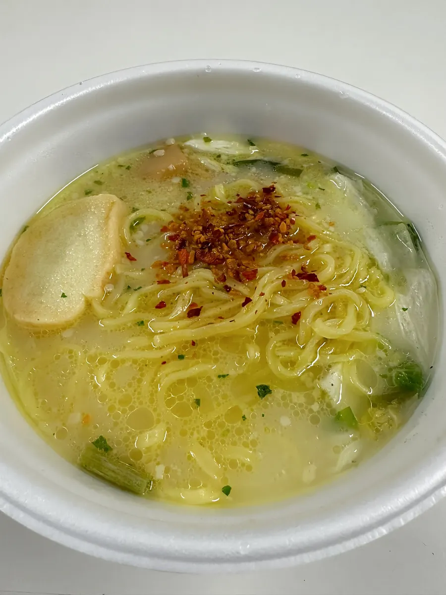 お湯は線よりやや多めに入れます。具材が寂しいので松尾さんのお麩も投入。