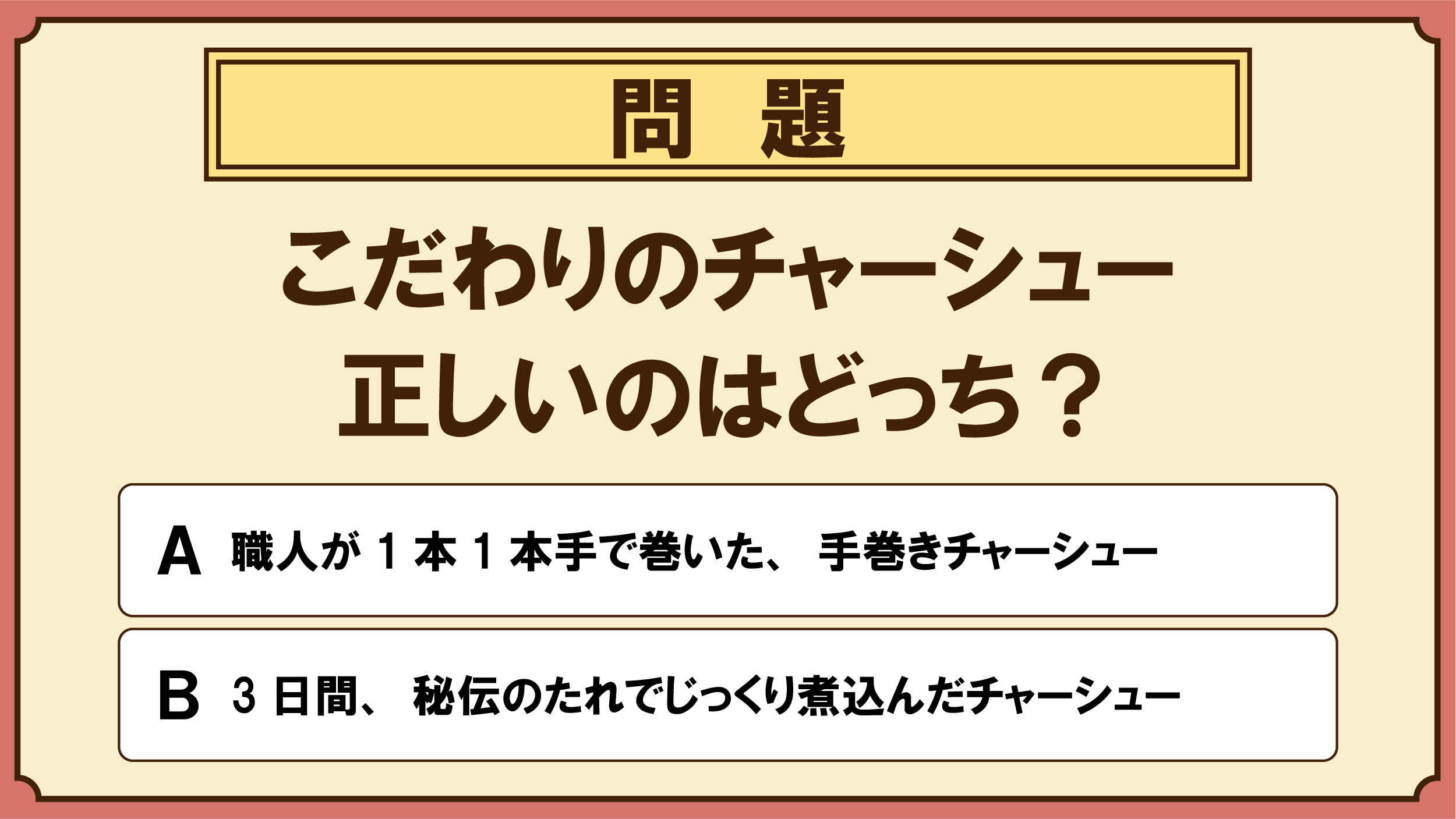 投稿を表示てっきり職人が3日間1本1本秘伝たれを使って巻いた煮込みチャーシューだと思ってたのでこの選択肢は難問ですね~!