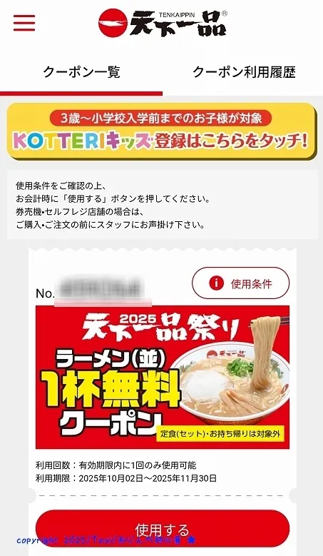 10/1・天下一品の日にもらった「ラーメン並1杯無料クーポン」ですが、