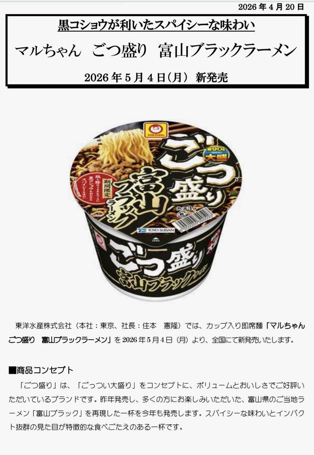 トップ > 凄トーク! > おしゃべり > ▼おしゃべりマルちゃんのごつ盛りシリーズから... 中電前の八百屋 2026/04/21 05:29 <p>▼おしゃべり</p><p>マルちゃんのごつ盛りシリーズから、富山ブラックが発売されるとの情報が…</p><div class="se-component se-image-container __se__float-none" style="width: 100%"><figure style="width: 100%;"><img src="https://community.dl-asobica.com/public/uploads/ckeditor/pictures/1107274/e14d603f-ec4f-4f9e-a206-7b8a2d556e96.png" alt="" data-rotate="" data-proportion="true" data-size="100%," data-align="none" data-percentage="100," data-file-name="e14d603f-ec4f-4f9e-a206-7b8a2d556e96.png" data-file-size="undefined" data-origin="," style="width: 100%;"></figure></div><p>期間限定の商品ですね。<br></p><p><br></p> ▼おしゃべり マルちゃんのごつ盛りシリーズから、富山ブラックが発売されるとの情報が… 期間限定の商品ですね。 マルちゃん 富山ブラック 限定商品 いいね 共有する 共有する X facebook LINE リンクをコピー トークにコメントする 5件のコメント (新着順) ミュートしたユーザーの投稿です。 投稿を表示 masa 2026/04/22 03:27 塩分量がすごそうです いいね 返信する ミュートしたユーザーの投稿です。 投稿を表示 たうい@おおさか 2026/04/22 02:11 去年も5月に発売されていますね!(小声ww) 去年と同じデザインなので再販かな? いいね 返信する ミュートしたユーザーの投稿です。 投稿を表示 まぼさく 2026/04/21 23:21 実は再販なんですよ(小声) いいね 返信する ミュートしたユーザーの投稿です。 投稿を表示 チョコマシュマロ 2026/04/21 17:48 こーなったらコレ買ってきて 食べ比べてみましょうか?🤔 いいね 返信する ミュートしたユーザーの投稿です。 投稿を表示 くろねこ 2026/04/21 07:32 2月にごつ盛り「新潟生姜醤油ラーメン」販売して、この度「富山ブラック」 各社、ご当地ラーメン出してきてますね。 いいね 返信する ミュートしたユーザーの投稿です。 投稿を表示 中電前の八百屋 2026/04/21 07:52 おはようございます。 そうですね。各社からご当地麺が発売されて、あちこちのスーパーなどでご当地ラーメンフェアも開催されています。 流行りですね。 ヤマダイさんは流行を先取りしてました。 いいね 返信する
