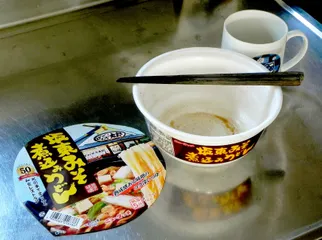 事後太郎 今日の昼メシは個人的にとても楽しみにしていた坂東みそ煮込みうどんだったんですが・・・今日は腹ペコの限界点を超えてしまっていたため写真を撮らずとっとと作って食べてしまいました 笑なので事後画像のみとなりますがあしからず次回はちゃんと写真撮りたいと思っとりますで、味がどうだったかっていいますと、超腹ペコ