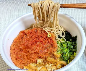 名代富士そば2025食べてみた! 「ニュータッチ 名代富士そば 紅生姜天そば」2025版をいただきました!去年から大きな変化はないのでさらっといきます、大きな変化→JANコードが違う!wwこれは去年の商品、ね!JAN違うでしょ!、ほかはほぼ同じかな?(値段は275→298円に)刻み揚げと生刻みねぎ、七味唐辛子追加、出来上がりはこんな