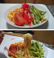 本日のランチは冷し中華♪ 我が家の定番…マルちゃんの【冷しラーメン】でした!麺2玉はキツかった(^_^;)