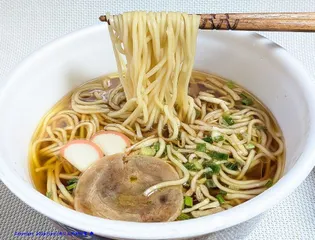 【先行食レポ】凄麺「岡山中華そば」をいただきました! 「超凄」特典でいただいた、「岡山中華そば」を食べましたのでレポさせていただきます!麺は中細麺、後入れ液体スープ、具材は丸チャーシュー、かまぼこ、もやし、ねぎです麺は4分湯戻し、具材を調えて、出来上がりはこんなビジュアルになりました恒例の「麺リフト~!」、中細の麺がいい感じですね~♫麺は今までになかっ