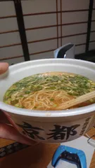 念願の京都酒粕ラーメン 関西地区限定販売この言葉に落胆してから数ヶ月、ついにヤマダイさんからの宝箱(ご褒美)が届き頂く事ができました😊✨️熱湯注ぎ4分、粉末スープを入れた途端😯‼️甘酒のような香りが立ち上ります。液体スープをさらに入れると酒粕香る鶏白湯麺スープに✨️クリーミーな優しい味に歯ごたえある麺🤣ウマイ‼️関西地区の