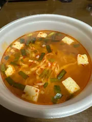 純豆腐チゲうどん 朝ラー2杯目純豆腐チゲうどんなんか豆腐がいい感じで回りましたね😄なんか最強の辛さと言われていますがどうも私にはそう感じられません。夏辛のインパクトがありすぎるせいでしょうか😅このうどん旨いんですけど麺の量は少ないですね。私なら普通に麺ダブルでイケそうです。と、いうことで替え玉です。なんと吉山製麺😅&