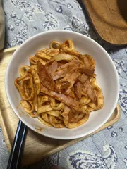 今日の晩御飯はひもかわの焼うどんケチャップ味