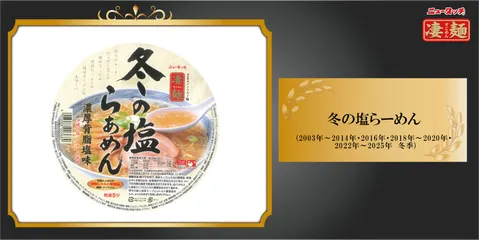 凄麺博物館No.058 冬の塩らーめん 凄麺ブランド、冬の風物詩!その記念すべき1作目がこちら!「冬の塩らぁめん(初代)」この商品が発売された当時、カップ麺の世界は、冬=こってり、味噌という流れが強く、冬季に塩らーめんが発売されることはほとんどありませんでした。そんな状況をあえて逆手に取って「冬に楽しめる、冬ならではの塩らーめんをつくって