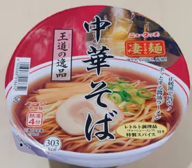 王道の逸品中華そば 王道の逸品中華そばを食べました。パッケージに書かれている通りホッとする醤油ラーメンで麺もレトルトチャーシュー、メンマも美味しく、あっという間に完食。いつもはそのまま最後までスープを飲み切るのですが、カロリー303kcal。今日の朝食は軽かったのでお腹がぐーぐー。ということで、替え玉ではなく替えうどん
