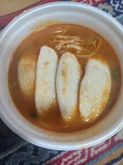 晩ご飯に仙台辛味噌を頂きました😸トッピングに笹蒲鉾を載せてみました😸 フライパンで軽く両面を炙りました😼 コレはイケますよ~😺辛味噌が苦手な方でも笹蒲鉾の甘味が箸休めになりますね😸気がつくといつも以上にスープを飲んでました😅
