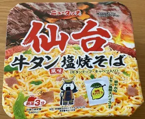 先日オーケーで見かけ気になっていたニュータッチの仙台牛タン風味塩焼そばをいただきました。湯切りしてから液体ソースをかけるとタン塩の良い香りが広がり食欲をそそります。免罪符の野菜炒めを加えて一口、コクのあるあっさりした塩味とタン塩の風味が良いですね。塩味も丁度よくスルスルといただけます。半分ほど食べた