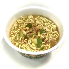 一目見てネギが大きく切ってあるなあと思いました。で、実際に食べてみたら、一口目は普通の味噌ラーメンという印象でしたが、三口目あたりから、唐辛子の刺激が一気に爆発!改めてカップの中を見たら刻み唐辛子があちこちに浮いていた。これには本当にビックリ。麺はフライ麺でしたが、スープとの相性、舌触りははとても良