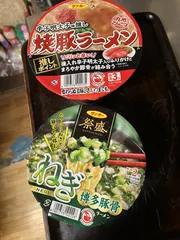今日の夜食 今日の夜食 嫁さんは焼豚ラーメン辛子明太子推し 自分は祭盛ねぎ博多豚骨ラーメン 二人ともサンポー食品(笑)