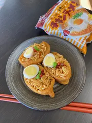 🦊チキらー稲荷🦊 麺活クッキング🍳! 本日のポストは昨日ポストいたしました🦊焼きそば稲荷🦊のチキンラーメンバージョンでございます。その名も「チキラーお稲荷さん」凄麺でもできますぉ! 作り方も簡単!チキンラーメンを作ってスープを切ったらお揚げさんに入れるだけ!彩をのせて