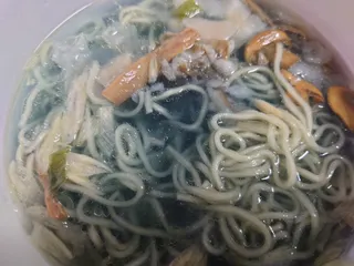新横浜ラー博凄麺 何をオーダーしたのか全く覚えていません。すごい色のラーメンですが、スープは[青]鶏しおを選んだみたいです。具材は、真ん中のがたぶん舞茸天。HPには載っていませんが、限定トッピングにあったような気がします。マッシュルームとワンタンとネギが確認できました。やはり青いスープは攻めすぎですね。