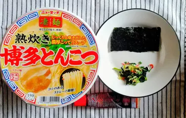 釜炊き博多とんこつ! スーパーの九州・沖縄フェアで入手!乾燥味噌汁の具・海苔・コチュジャンをプラス!待ち時間が2分と短いので急ぐ!美味しくいただく!『長崎ちゃんぽん』も一緒に購入しているので何をプラスするか?思案中!