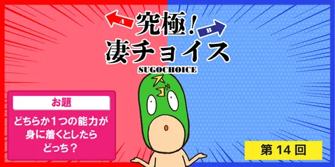 第14回 凄チョイス! 第14回 究極!凄チョイス!「究極!凄チョイス!」は凄麺やグルメにまつわる"こんなの選べない!"という究極すぎるお題に対して自分だったらどの選択をするのか、みなさんに投票していただく企画です。今回のお題はこちら!どちらか1つの能力が身に着くとしたら、どっち?A. 3か月先まで新商品が見通せる! 凄麺