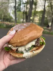 NEW 87cafe🌸 バナナマンのせっかくグルメ‼︎博覧会 in 新宿高島屋🍌長野のハナカフェさん🐻BLTバーガー🍔パティに牛タン使用🐮テイクアウトです🌟昨日焼き立て提供して頂いたけど会場から歩いて20分くらい掛かりました💦新宿中央公園の花々に囲まれて頂くハンバーガーは最高でした😋ベンチに座ってチュ