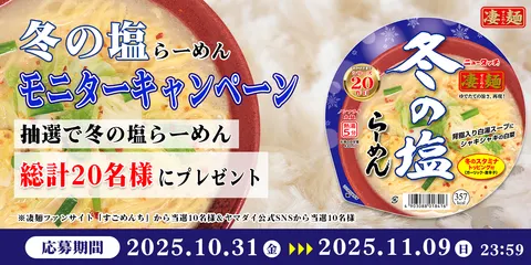 NEW 冬の塩らーめん モニターキャンペーン 今年で20作目となる「冬の塩らーめん」を、たくさんの方に楽しんでいただきたい!という思いから、モニターを募集します!冬の塩らーめんは、「冬に食べたい、心も身体も温まるおいしい塩らーめん」をコンセプトに、その年ならではのおいしさ要素を加えて発売している、冬限定商品です。【今年の冬の塩らーめんのポイント