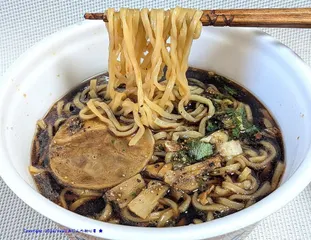 NEW 【スゴ活】富山ブラック2026食べてみた! リニュ版、見つからなかったので問い合わせ窓口のお世話になり、めでたく入手できました前回は2022年8月リニューアル(左)、それにしても似てる!、「間違い探し」レベルww湯戻し5分ですが、今回も当然途中お湯替え方式で作りました、がんばってヤラセトッピング😅麺は太さ5段階中太い方から2番目の麺、2番目で