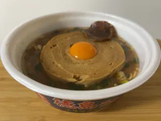 ◆使用した凄麺徳島ラーメン濃厚醤油とんこつ味🍥◆アレンジポイント卵黄➕卵白ホイップ➕車麩🥚材料2つでシンプルに✌️いつもより良い卵使いました🤤徳島ラーメンは豚バラ肉が入るイメージなので肉感を車麩で代替🐷越後特産四回巻の車麩をぬるま湯で戻してからスープに投入👌穴が丁度良く卵黄ポケットになりました🐣卵白