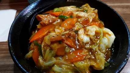 スタミナラーメン🍜スタンプ6個目🌟今回初対麺🫶凄麺25年目にして初の茨城ご当地ラーメンめでたいですね🎉 甘めのとろみスープでほっこり☺️後からピリッと唐辛子が追いかけて来ます🌶️極太麺がしっかり絡んで美味しい😋コロっとした可愛いかぼちゃやお野菜たちが良い味出してますね✨
