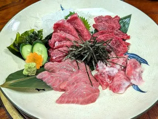 NEW ちょっと旨いもん食べてきました~! いつもの近所のブロ友さんたちと「ちょっとええもん」食べに心斎橋へ!自分、待ち合わせ時間を勘違いして1時間遅刻したのはヒミツですwwブログ仲間なので乾杯の撮影は欠かせませんwwここはまぐろが最高のお店!、「本まぐろのツラ身 4種盛り」、これが最高です(手前左=脳天肉、手前右=眼肉、奥左=ほほ肉、右・の