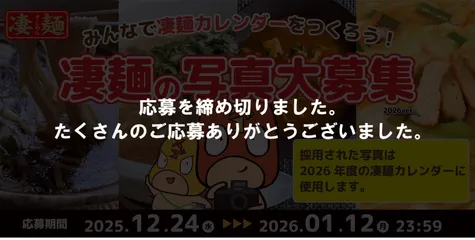 今年もやります!みんなで凄麺カレンダーをつくろう!凄麺の写真大募集!普段「今日の凄メシ」に投稿されているような、凄麺のシズル写真や凄麺コレクションの写真・凄麺とペットとの写真など、凄麺に関する写真であればなんでもOKです!凄麺カレンダーに写真が採用された方には、後日、凄麺カレンダーをプレゼント致しま