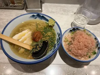 大葉香る梅塩らーめん🌸➕本枯節のおかかごはん🍚全粒粉入り極細麺に大葉の風味と紀州の大粒梅干しがアクセントになってさっぱり爽やか~😋フワフワおかかたっぷりのご飯に残りスープをかけてワサビを溶いて〆のお茶漬け風も楽しめます🫶これからの時期におすすめなメニューです🍥